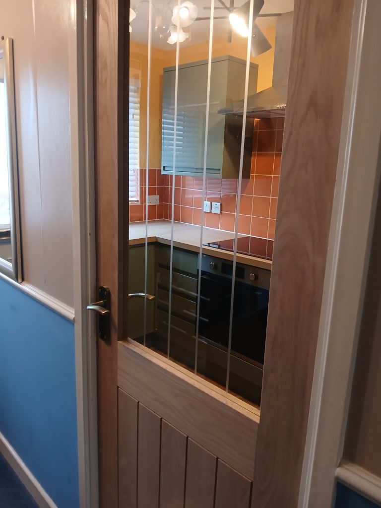 Glazed doors can make a huge difference, spreading light throughout a home. This customer wanted a door because he loves his son and daughter visiting, but they have a spicy food taste which the customer does not. A glazed door was a happy medium to keep an open feel whilst allowing the spice smell to stay in the kitchen.